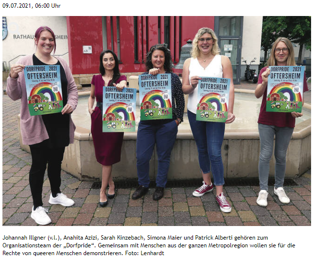 Oftersheim. Bunt, laut und vielfältig soll die „Dorfpride“ sein, die am Samstag, 31. Juli, durch Oftersheim ziehen wird. Eine Parade für die Rechte von LSBTTIQ-Menschen. Damit sind all jene gemeint, deren sexuelle Orientierung oder geschlechtliche Identität von Hetero-Normen abweichen. Die Abkürzung steht für Lesben, Schwule, Bi- und Intersexuelle sowie Transgender. Letztere sind Menschen, die sich nicht oder nur teilweise mit dem Geschlecht identifizieren können, das ihnen bei der Geburt zugewiesen wurde. Diese Menschen fühlen sich sozusagen quer zur Norm und bezeichnen sich deshalb als „queer“.