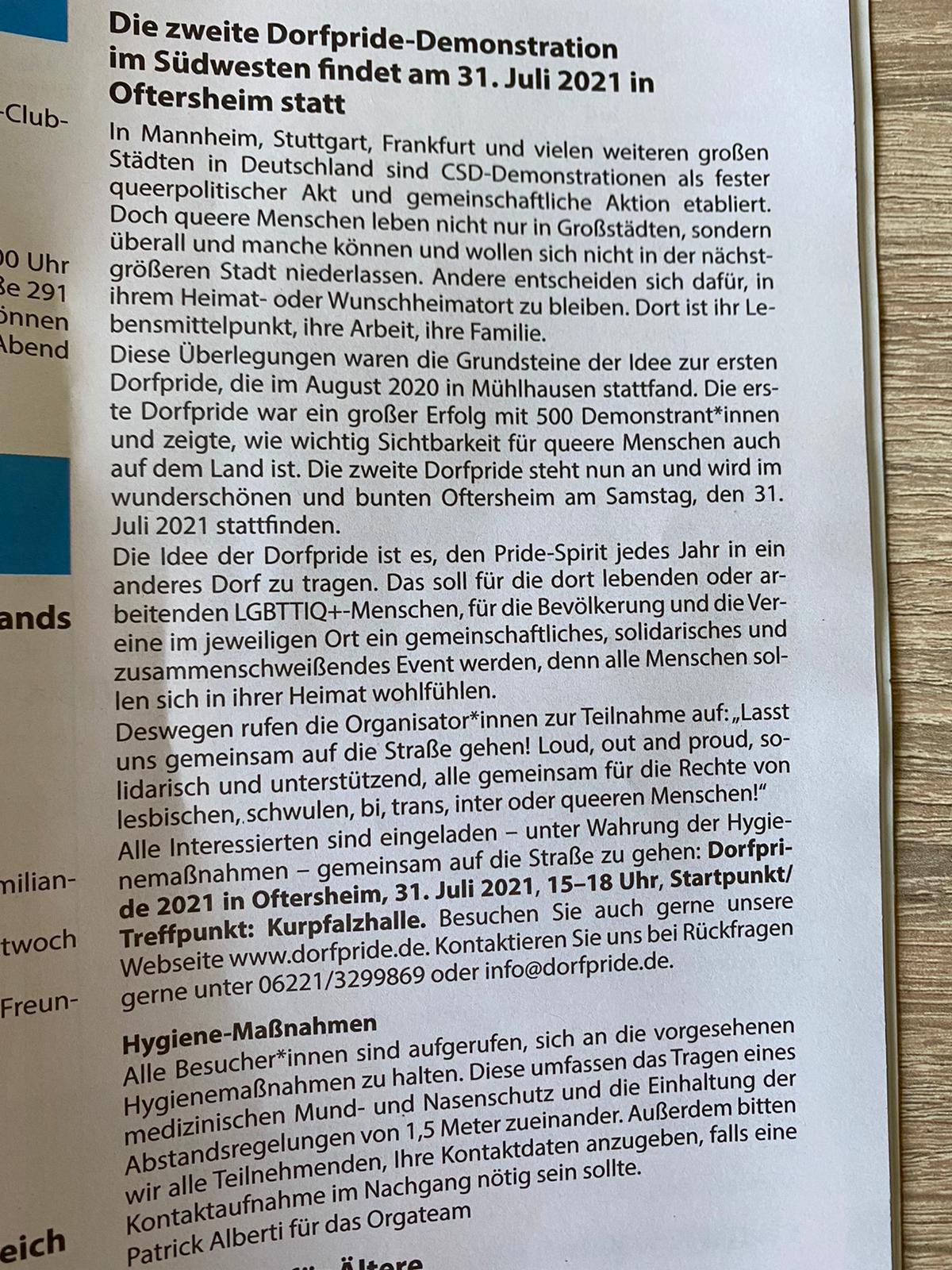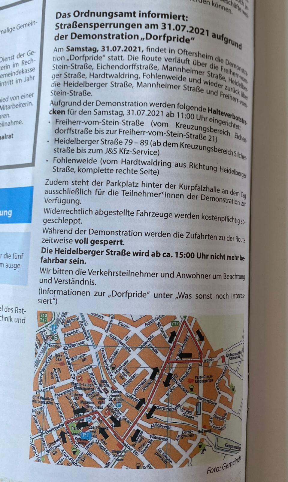 Nun kann nichts mehr schief gehen, die Dorfpride und die Demo Route wurde offiziell im Mitteilungsbatt der Gemeinde Oftersheim veröffentlich!